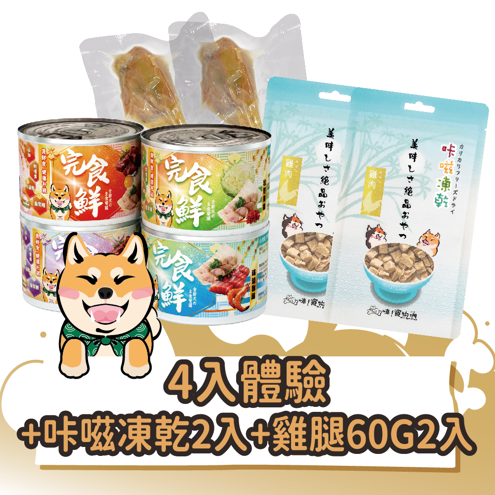 【嗨寵物們】經典搭配狗狗體驗組|完食鮮主食罐4入+咔嗞凍乾2入+化骨雞腿2入|慢火燉煮真鮮食|挑嘴汪最愛
