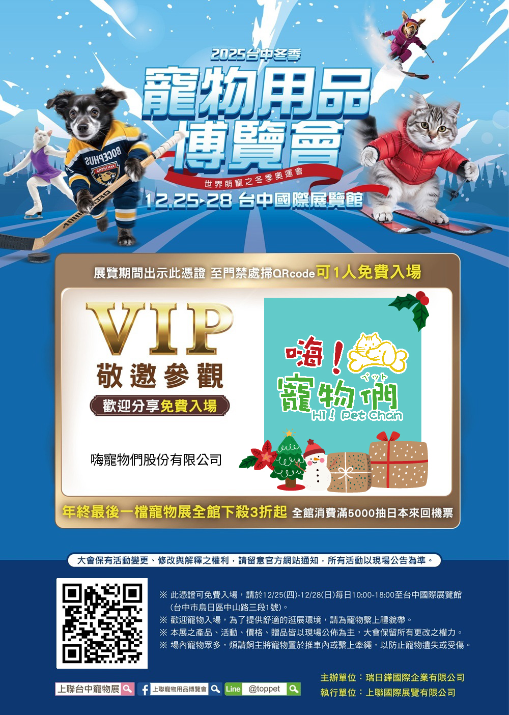 2025年度 嗨!寵物們 最後一場寵物展 in 台中國際展覽館 !我們的攤位是913!12/25(四) – 12/28(日) 每日10:00 – 18:00,歡迎中部的朋友有空前往參觀!以下提供展場限定活動及嗨寶粉絲專屬VIP門票,寵物展入口出示門票畫面,即可直接入場喔!