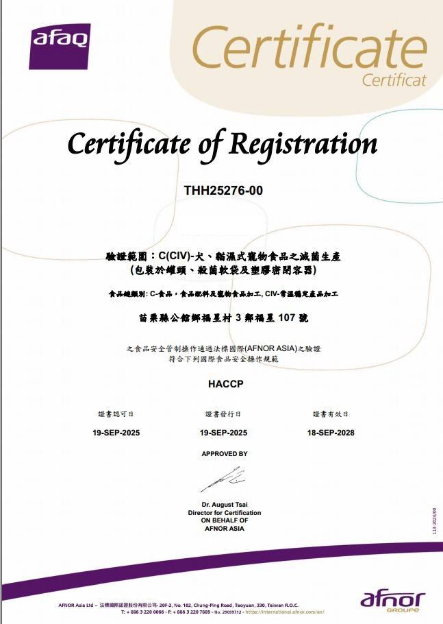 台灣少數達到出口級水準的寵物濕食品牌,確保每一罐都安心、潔淨、安全。